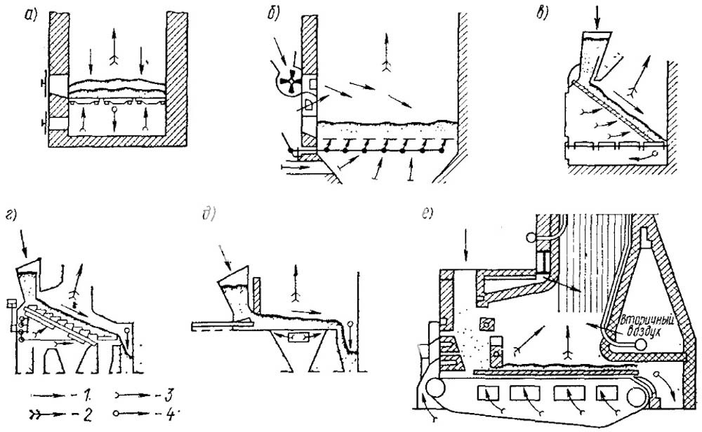- с неподвижной колосниковой решеткой и перемещением топлива по решетке (в, г, д);